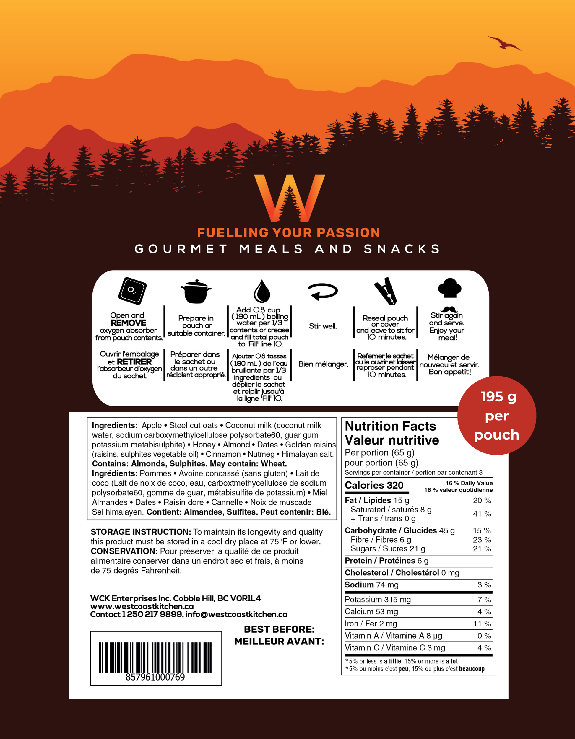 Ingredients: Apple, Steel cut oats, Coconut milk (sulphites), Honey, Almond, Dates, Golden raisins, Cinnamon, Nutmeg, Himalayan salt