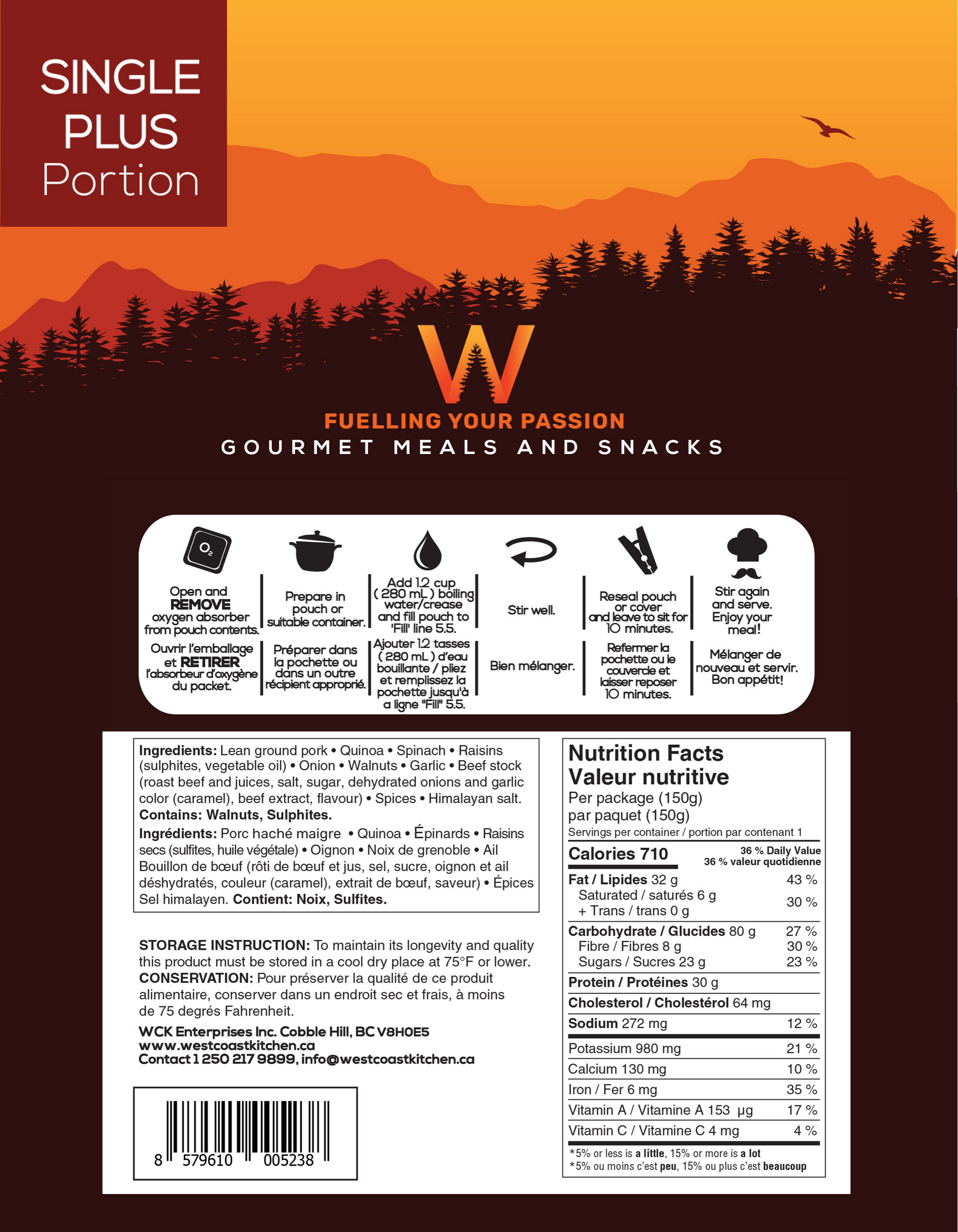 Ingredients: Lean ground pork, quinoa, spinach, walnuts, raisins (sulphites), onion, garlic, sunflower oil, vegetable stock (gluten-free), paprika, oregano, fennel seed, black pepper, Himalayan salt, chili powder.